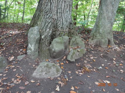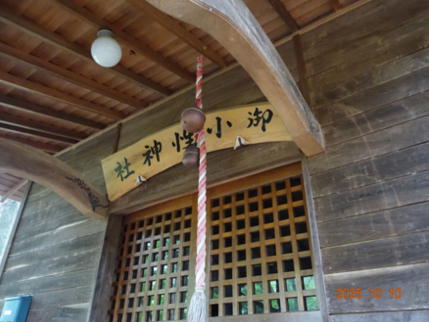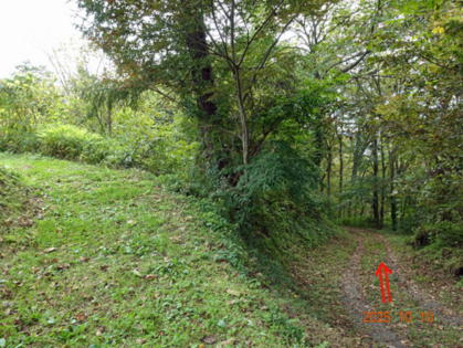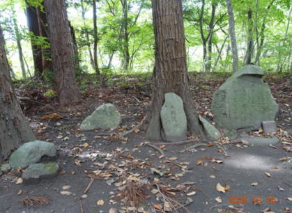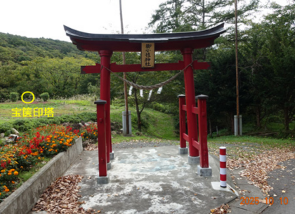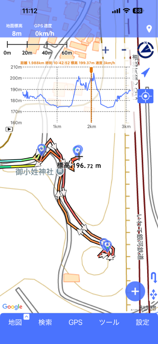 *背景の地図で、「御小性神社 鳥居マーク」のあるところは、GoogleMapが 「御小性神社」と表示している位置になります。 *実際に神社が鎮座する場所は、画面下部の丸い等高線の内側にあります。 *境内は丸く高くなった場所であることが、等高線から分ります。 境内のすぐ東側に鉄道線路があります。 *記録された軌跡でおよその標高を見ると、鳥居の所で196m、下り道の分 岐の所が低く180m、社殿前は191mですので、鳥居から16m下って 11mのぼって社殿です。 なお、スマホのコンパスでは高度190mでした。 *標高表示のある十の位置は、宝篋印塔の場所です。 *軌跡上のカメラマークは軌跡の記録中に写真を撮った場所です。 上部の左は、駐車場所から鳥居へ向うところで、下は社殿前で、上の右は 宝篋印塔の所です。撮った写真を載せます。 軌跡の線と地図に若干のずれがあると思います。 *地図では丸い等高線の斜め左下に横長の建物があるようです。下り道を私 有地看板の先に行けば、建物がある(あった)のかもしれません。 |