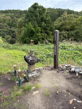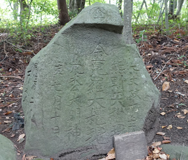 ・碑面を加工し上部に山形の部分を残して、そこに金を丸で囲った文字があります。 ・碑面は、右から「□文政十年/熊野大権現/〈一文字上から始めて、文字も大きい〉金毘羅大権現/光枩大明神/□七月十日」、左側面に「同 清二/万之丈」と読めるようです〈□判読不明ですが、干支の丁亥でしょうか〉。石碑の右側面にも名前があったのでしょうが、写真がありませんから気付いていなかったのでしょう。 |